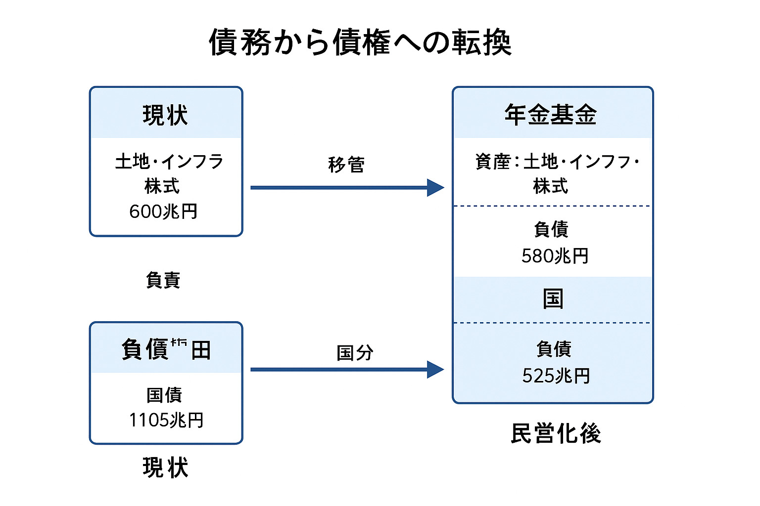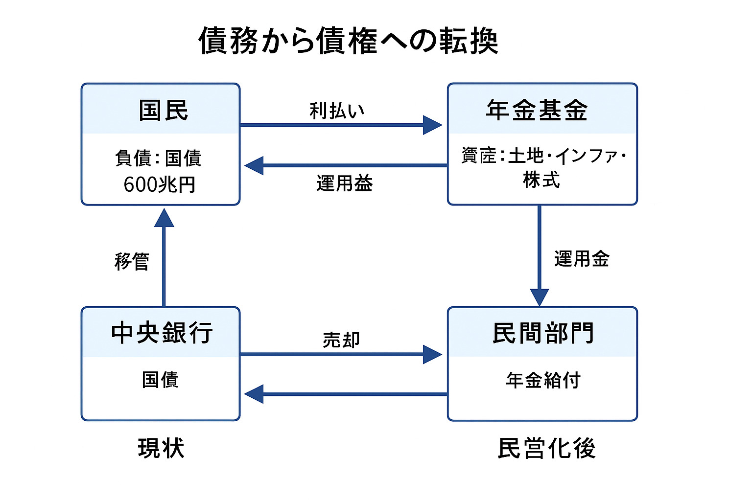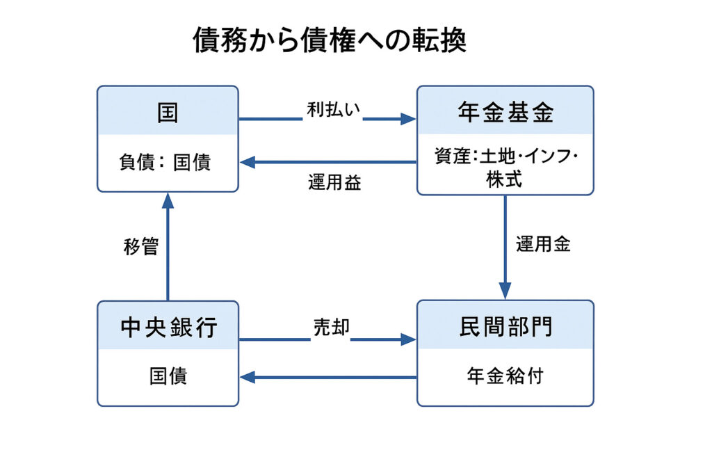 国:負債(国債)を年金基金に利払い。 年金基金:国有資産(土地・インフラ・株式)を保有し、運用益で年金を支払う。 中央銀行:国債を年金基金に移管し、バランスシートを縮小。 民間部門:年金給付を受け、資金が実体経済に循環。