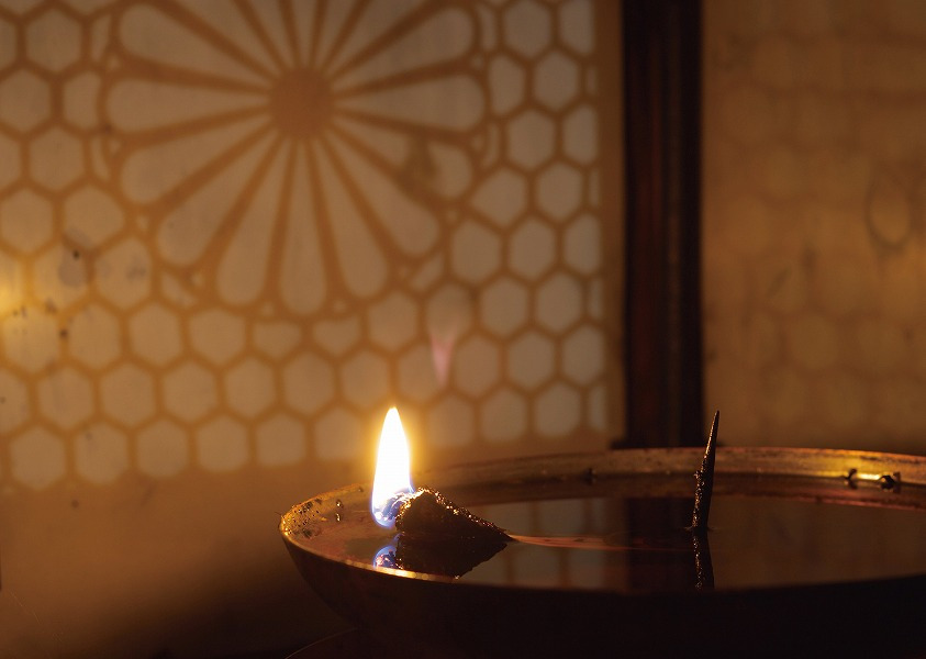 先ほどの写真より少し引いた視点で、燈明が見えます。炎はさらに小さく見える。しかし壁に映る光の紋様は、変わらず広がっている。